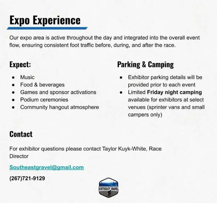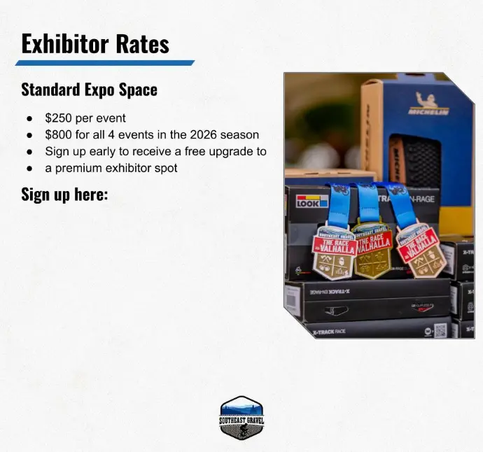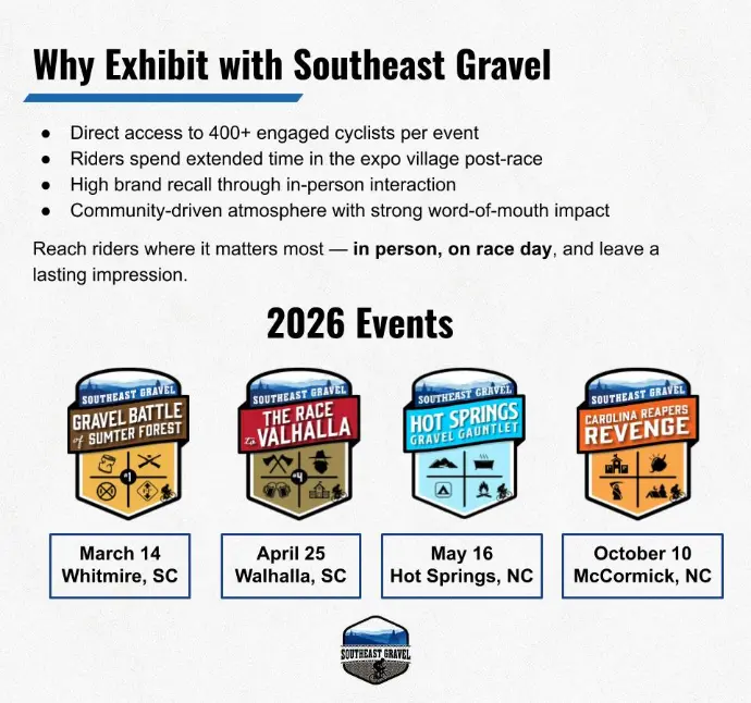 Showcase your products in front of 400+ cyclists who will all be at the Southeast Gravel events
